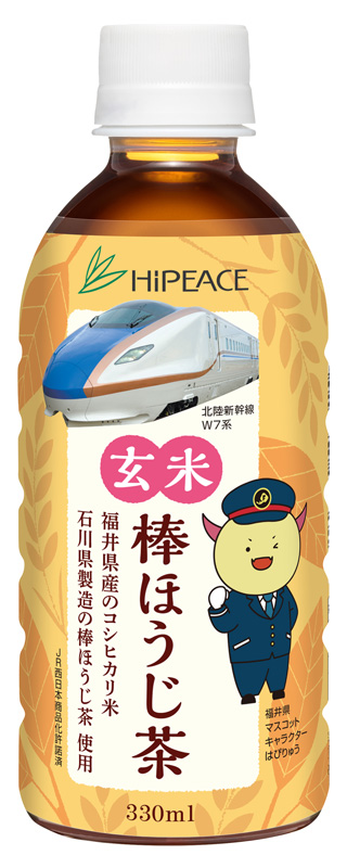 北陸新幹線延伸記念ラベルです。福井県発祥の「コシヒカリ」の焙煎米と、石川県で親しまれている「棒ほうじ茶」を合わせ、香ばしい味わいに仕上げました。